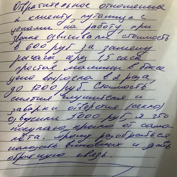 Отвратительный сервис , ни кому не рекомендую , после всего произошедшего да же не извинились ((( обман с расценками , со временем выполнения работ , всем своим знакомым и не знакомым при каждом удобном случае буду расказывать свою грустную историю ! Для руководства смотрите книгу жалоб и принимайте меры ...